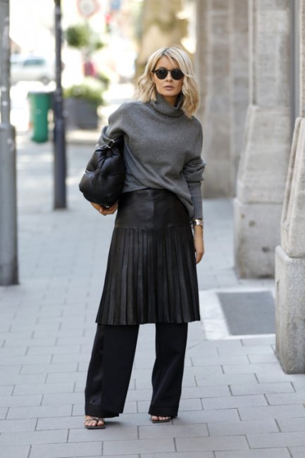 Поверх брюкПлатье поверх брюк - большой тренд сезона, который практически сразу после подиумов заполонил улицы модных столиц, где с легкой руки модниц прошел некую трансформацию - платье сменилось на юбку длины миди, продолжая тенденцию на многослойность. Чаще всего streetstyle-звезды выбирали оттенки серого и черного, создавая тем самым нескучные монохромные образы. Советуем присмотреться к такой стилизации уже сейчас, ведь у нее есть все шансы стать настоящим хитом сезона.