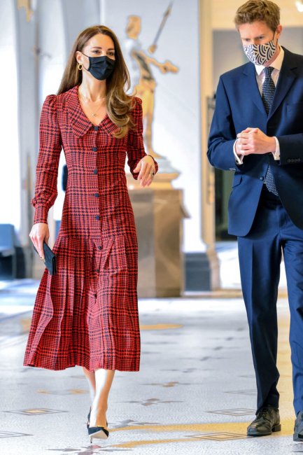 Кейт МиддлтонКейт Миддлтон выбрала красное платье с длинными рукавами в ломаную клетку, которое было украшено отложным воротником и большими пуговицами спереди. Увеличенная линия плеча и заниженная талия платья стали для герцогини новым экспериментом в своем стиле. Ранее Миддлтон чаще всего надевала платья A-силуэта. Свой образ Кейт дополнила темно-синими туфлями Jennifer Chamandi, замшевым клатчем Mulberry, украшениями Spells of Love и Asprey London.