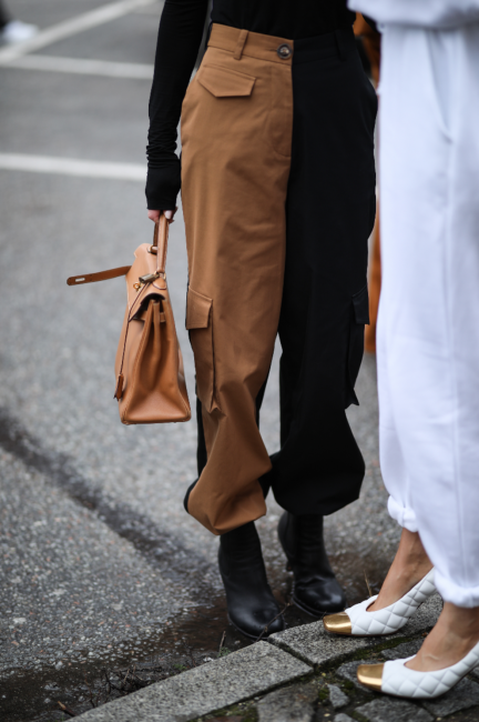 Смелые модницы сумели адаптировать карго, отсылающие к мужской рабочей униформе, к легким и нежным образам, стилизуя их с просторными маскулинными сорочками и сумками из плетенной кожи "конфетных" оттенков и неоновыми туфлями с острым мысом. Такая эффектная комбинация поможет создать расслабленный и одновременно нарядный лук. Разнообразить сезонный гардероб также помогут двухцветные карго - сочетать их лучше всего с однотонными водолазкой и обувью, а подобранные в тон аксессуары только усилят эффект.