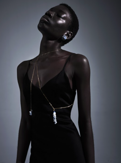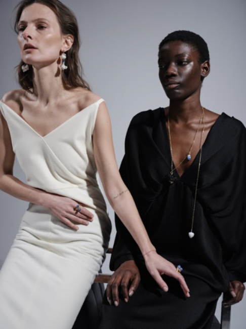 Украшения представлены в белом и черном цветах с вкраплениями других оттенков. Изделия украшены мазками золота, а в качестве фурнитуры использованы шелковые шнурки и позолоченная латунь. Фарфор, имитирующий натуральный жемчуг, - еще один прием, использованный в коллекции. Иконические для бренда артишоки также присутствуют в качестве ювелирных изделий - они произведены вручную.