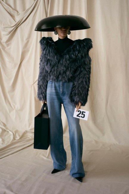 Balenciaga Couture осень-зима 2021/2022Текстуры играют в моде Balenciaga такую же значимую роль, как и инновационные ткани: объемная куртка из серебристого искусственного меха и пальто из декоративных перьев созданы с использованием техники вышивки шелковыми нитками. Также в коллекции есть юбка, драпированная вручную, джинсы свободного кроя из искусственной крокодиловой кожи и пальто, похожее на халат, из ткани с микропорезами.