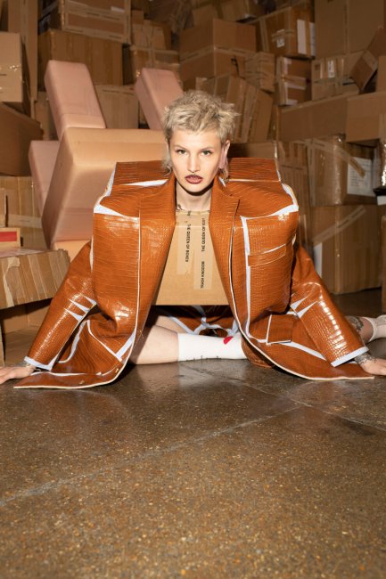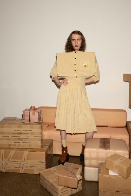 «Коробки стали обычным мусором в нашей повседневной жизни. Будь то ежедневные поставки из интернет-магазинов, китчевые распаковочные видео, наводняющие социальные сети, или просто радость от открытия чего-то в упаковке — новая коллекция основана на последних 18 месяцах жизни, — говорит Зинько. — Окунувшись в безумие домашнего обихода и ища новые способы задействовать наивное творчество, я начала разрабатывать коллекцию, играя с размещением картонных коробок на собственном теле, в конечном итоге переработав их в настоящую одежду».
