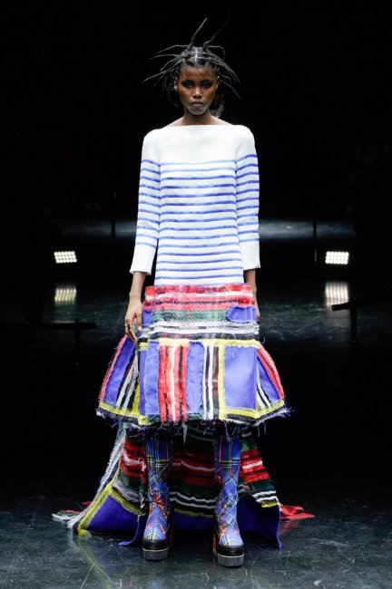 Jean Paul Gaultier Couture осень-зима 2021/2022В Sacai не задумывались о покорении мира кутюра, однако возможность проявить себя с этой стороны произвела “действительно захватывающее впечатление”. По словам Титосэ, они с Жан-Полем одинаково смотрят на понятие совершенства, поэтому процесс их совместного творчества проходил плавно и гармонично. Скрытая роскошь ее штрихов в виде десятков крошечных оборок на внутренней стороне юбок отлично сочетались со знаковыми полосками свитера Jean Paul Gaultier и вставками из атласной органзы, которые, казалось, растворялись в слоях шифона.