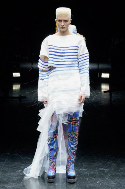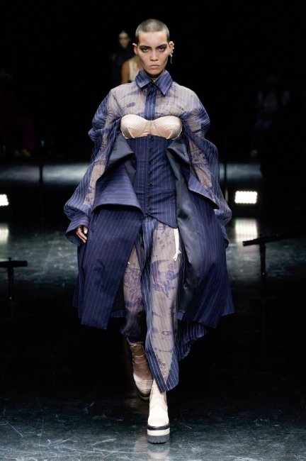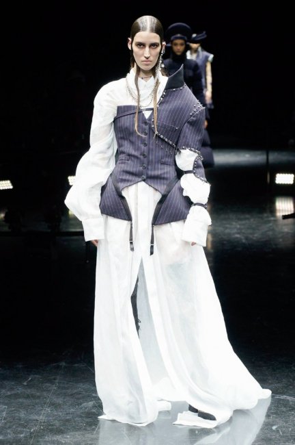 Jean Paul Gaultier Couture осень-зима 2021/2022 Jean Paul Gaultier Couture осень-зима 2021/2022Настоящая поклонница Дома, Титосэ не прибегала к помощи архивов: “Я не хотела рассматривать их буквально, чтобы иметь свободу передать настроение Sacai и актуальное течение времени”. Например, для первого образа коллекции, из реконструированного мужского костюма в тонкую полоску переосмыслили культовый конический топ Jean Paul Gaultier 1984 года. В итоге получились корсет, верхняя юбка и сетчатые элементы – вечная классика с настроением панка.