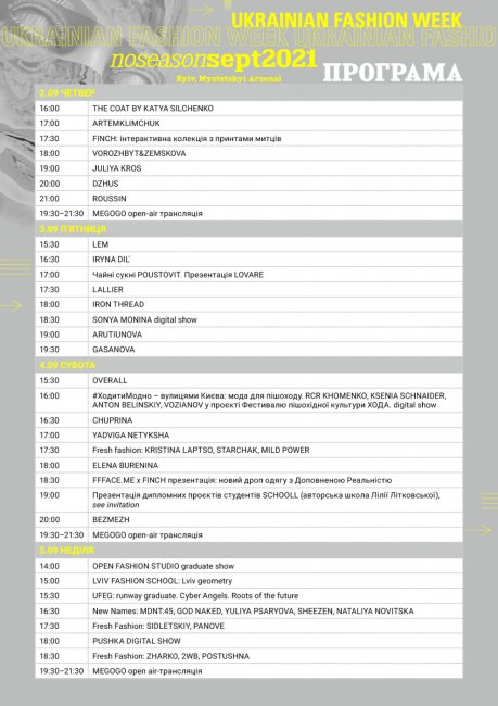 Несколько сезонов тому назад Ukrainian Fashion Week, осознавая вызовы, стоящие перед любой Неделей моды и демонстрируя готовность отвечать на них, с целью поддержки украинских дизайнеров, объявил концепцию внесезонности — NO SEASON Season и предложил так называемый phygital-формат проведения шоу. Гибридный формат UFW предусматривает инклюзивность для всех, кто интересуется украинской модной индустрией, благодаря открытому online-доступу к показам. Профессиональное сообщество — представители медиа, байеры, инфлюенсеры — приглашены посетить Неделю моды и ознакомиться с коллекциями дизайнеров offline, соблюдая карантинные ограничения.