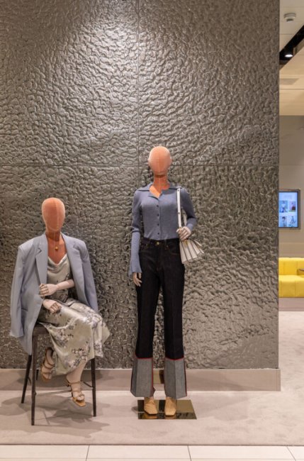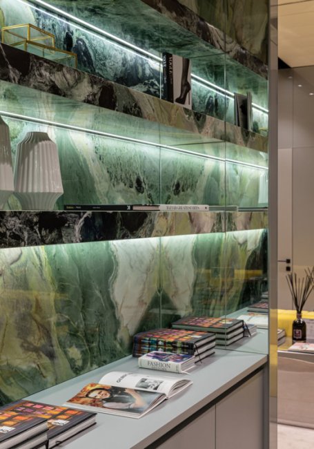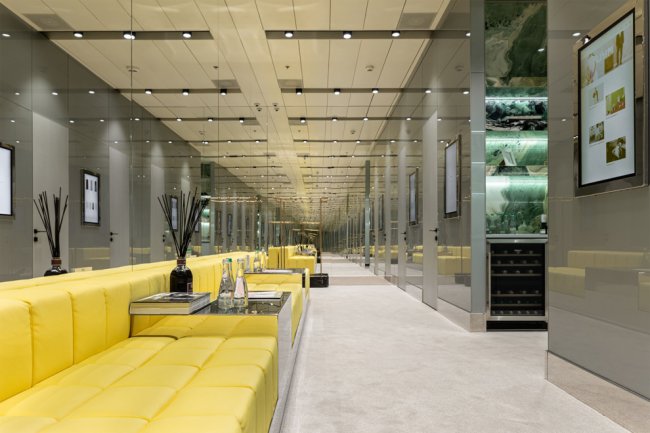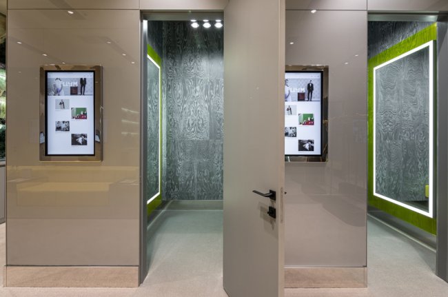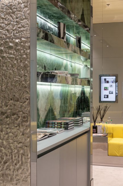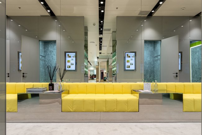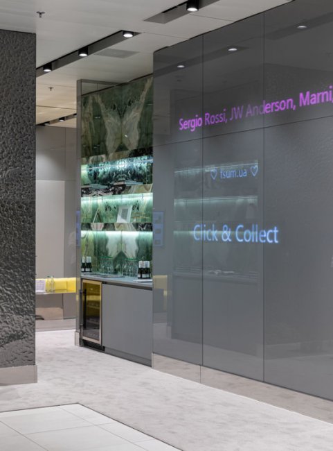 Новое пространство Click&Collect в ЦУМНа 80 кв. м объединено три функциональных пространства: касса с бегущей строкой на матовой поверхности, комфортная зона отдыха с ярко-желтым диваном и примерочные с большими зеркалами и подвесными люстрами. В интерьере преобладают такие материалы, как оплавленное стекло и мрамор. Уютную атмосферу в Click&Collect создают элементы дизайнерского декора, аромадиффузоры и коллекция книг издательств Assouline и Taschen.