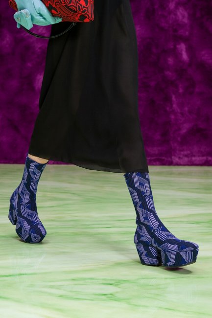 FlatformsКансай Ямамото, 1972 год"Плоские платформы", известные на английском языке неологизмом flatforms, были представлены как идеальная альтернатива туфлям на каблуке, без ущерба комфорту. В этом сезоне нет обуви, которая могла бы противостоять им: в своей вдохновленной балетом коллекции Erdem поднимает балетки на платформу, а Molly Goddard цитирует flatforms в рокерском исполнении с металлическими вставками. Возможно, самую ироничную версию демонстрируют Schiaparelli: Даниэль Розберри играет с иронией, показывая пальцы на обуви, покрытые золотым цветом. Миучча Прада же этой осенью возвращается к плотно прилегающим к ноге ботфортам.