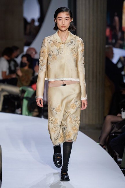 Miu MiuЧтобы добавить праздника в офисный гардероб, дизайнер расшила бисером и стеклярусом серию черных костюмов и сдержанных платьев, а также украсила нежными цветочными аппликациями атласные костюмы в пастельной цветовой гамме. Забудьте о повседневных пятницах - в 2022 году будут лишь причудливые. Однако на тот случай, если в этом «новом сексуальном» обществе останутся те, кто не готов к изменениям, дизайнер предложила несколько альтернатив смелому корпоративному гардеробу. Так, вязаные юбки в "косичку" с высокими разрезами в сочетании с рубашками и выцветшими объемными джемперами создавали реалистичный образ «костюма поколений», равно как кожаная куртка и юбка со складками с вымытым эффектом. На подиуме также появились строгие лоферы в паре с высокими носками, вместительные серые брюки в стиле Кэтрин Хепберн и множество роскошных верблюжьих пальто и тренчей.