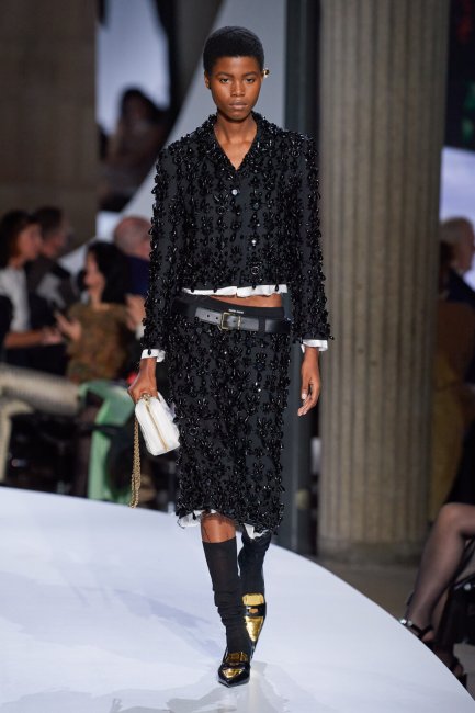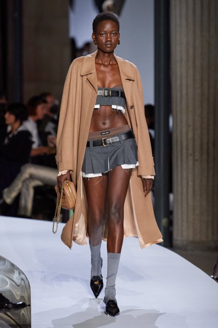 За основу коллекции дизайнер взяла эстетику нулевых, которая все чаще стала появляться на модных подиумах – Миучча позаимствовала из этой эпохи экстремально низкую посадку. Так, бермуды, широкие брюки и юбки в складку теперь держались низко на бедрах, оголяя резинку нижнего белья, как ранее носили модные иконы 2000-х Бритни Спирс и Пэрис Хилтон. В некоторых образах на смену белым строгим рубашкам, как и предполагает рабочий дресс-код, пришли нюдовые и черные бра, а юбки достигли такой миниатюрной длины, что их смело можно было бы назвать пляжными.