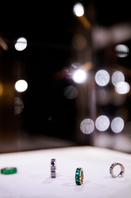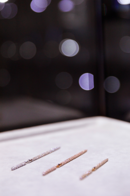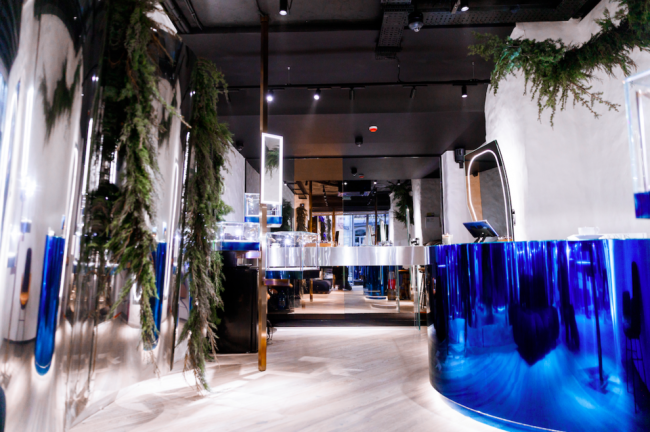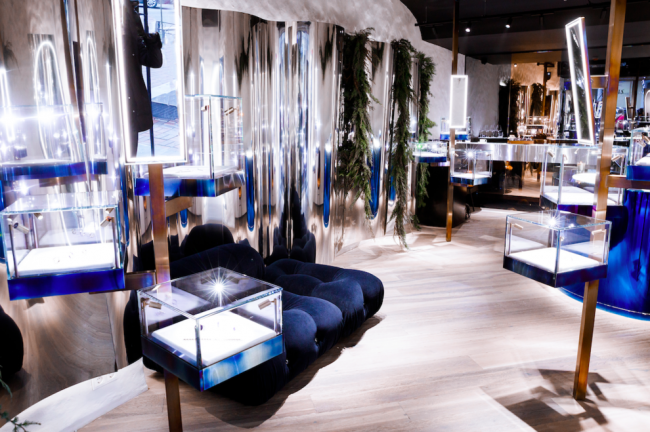 Над интерьером бутика работали девелопер Арье Шварц и дизайнер Елена Добровольская, создающие проекты по всему миру. Металлические поверхности, зеркала, множество источников холодного белого света и синие акценты создают в пространстве атмосферу футуристичности. Синий выбран главным в интерьере не случайно — он символизирует сапфиры, которые часто использует бренд в своих украшениях.