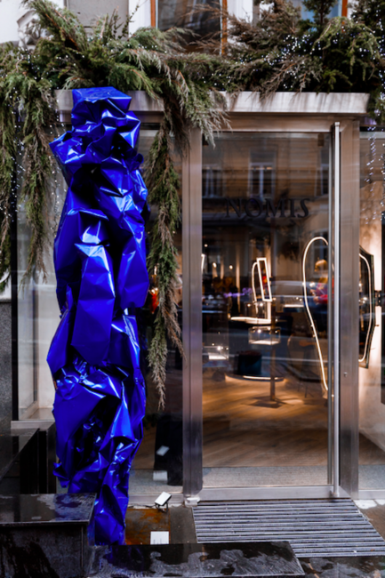Фасад бутика Nomis украшают экран с digital-артом и синяя металлическая скульптура современного украинского художника Михаила Деяка — его работы находятся в частных коллекциях Украины, Канады, США, Великобритании, Франции, Швейцарии, Венгрии и Китая.