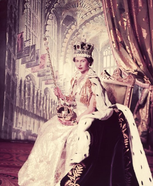 Официальный портрет герцогини КэтринЕлизавета IIКоронация Елизаветы II состоялась в 1953 году, а первый официальный портрет юной королевы было доверено сделать фотографу Сесилу Битону, который также снимал Одри Хепберн, Мэрилин Монро и Уинстона Черчилля. Битон запечатлел ее в платье авторства придворного модельера Нормана Хартнелла, фиолетовой мантии, сшитой специально для этого мероприятия 12 мастерицами, и императорской короне, созданной еще в 1820-м году.