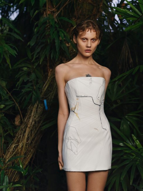 В коллекцию вошли брючный костюм с телесным принтом на внутренней стороне, переосмысленные через роботизированные детали классические черные платья, одежда из черной глянцевой кожи с принтами, вдохновленными искуственными интеллектом, которые контрастируют с элегантными кружевными элементами.