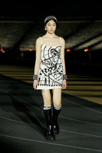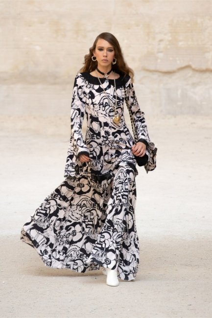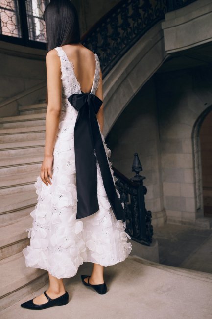Отправной точкой при создании коллекции Chanel Resort 2022 послужил черно-белый фильм «Завещание Орфея» режиссера и друга Габриэль Шанель Жана Кокто. Дизайнер Виржини Виар представила черно-белую коллекцию, которая изредка была разбавлена вкраплениями синего, фиолетового и розового. На подиуме появились роскошные платья с отложными воротниками, фирменные твидовые наряды и модели с графическими рисунками. Дизайнер Эли Сааб в своей круизной коллекции также сделал ставку на классическое сочетание черного и белого цвета. В коллекции бренда появилась серия нарядов из тонкого твида, романтичные платья в гороховый узор, платья с вертикальными полосами и образы с изысканными вставками кружева. Невероятно нежное и романтичное платье в этом сезоне вы найдете в круизной коллекции Carolina Herrera - белоснежный образ с цветочной аппликацией и контрастным бантом на спине. Завершить выход можно черными балетками или изящными босоножками.