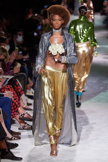 Alessandra RichБрюки с пайетками и сверкающей бахромой стали уже визитной карточкой дизайнеры Альберты Ферретти. Если ранее этот бренд славился своими летящими платьям из шифона, то теперь в линейке марки появились знаковые нарядные брюки, которые легко комбинировать с базовым верхом в виде футболки, топа или жакета. Украсить свой гардероб этой весной можно не только блестящим платьем, но и модными брюками в золотом оттенке, как завещает Том Форд. Если же вам хочется надеть элегантный и в то же время дерзкий образ, то вам прямая дорога к Энтони Ваккарелло, который предложил черные атласные брюки с высокое посадкой, моделирующие бесконечные ноги, сочетать с бархатным топом с глубоким декольте.