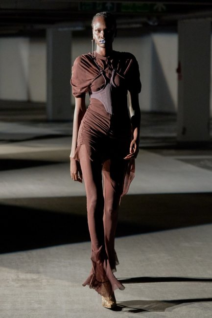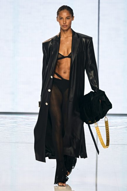 VersaceПолупрозрачные фактуры - один из самых модных трендов этого сезона. Нежный шелк, невесомая тюль, органза, деликатный шифон украсили коллекции весна-лето 2022. Знаменитости и streetstyle-звезды уже давно полюбили эту тенденцию, демонстрируя на красных дорожках смелые "голые" наряды. Однако помимо полупрозрачных платьев в коллекциях брендов можно встретить большое количество "голых" брюк. У Blumarine вы найдете брюки-карго из желтого шифона, у Balmain - трикотажную модель в черном цвете, у KNWLS - коричневые брюки, повторяющие контур фигуры, а у Allesandra Rich - вязаную крючком модель, в которой можно отправиться на пляж вместо туники.