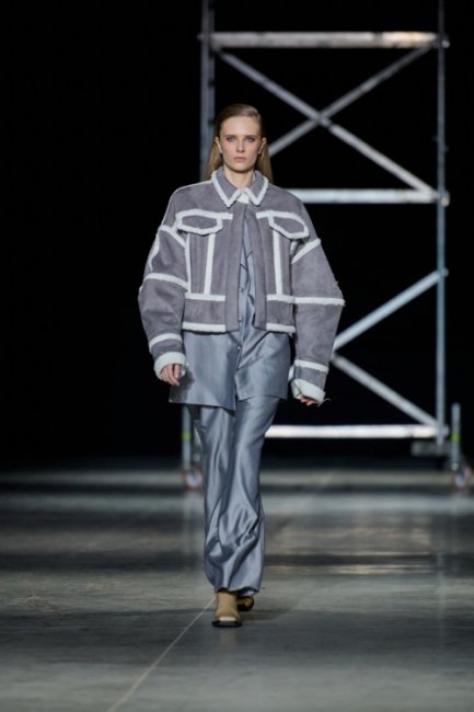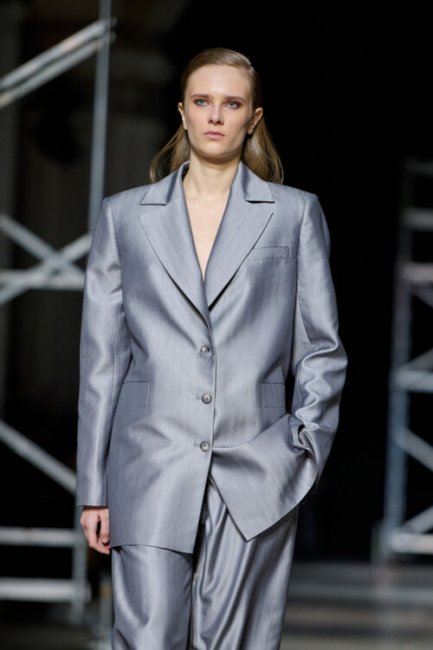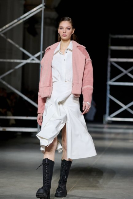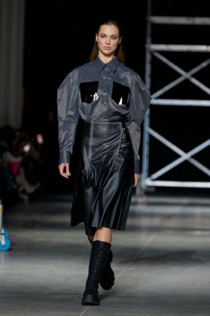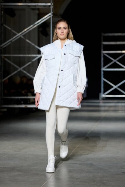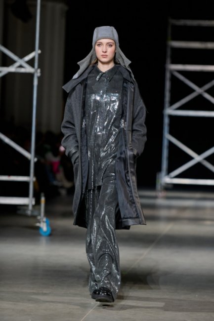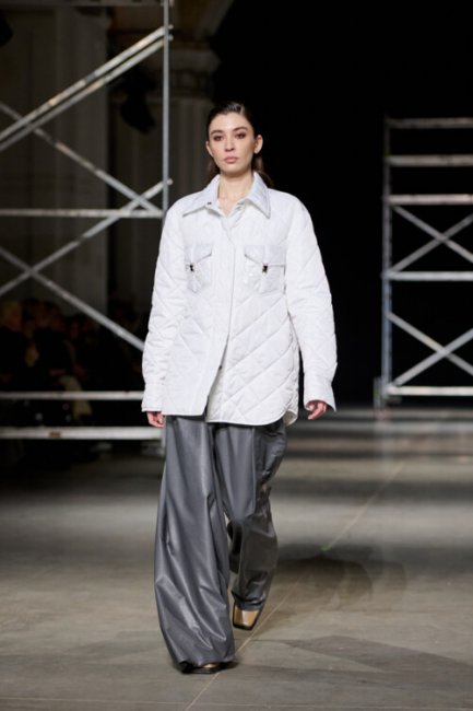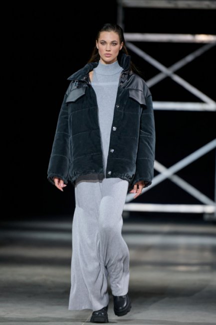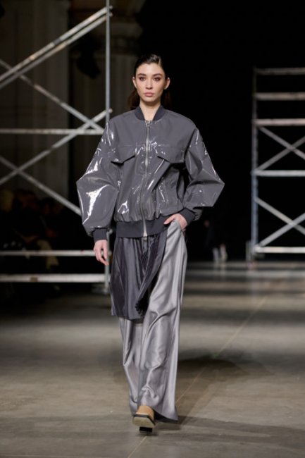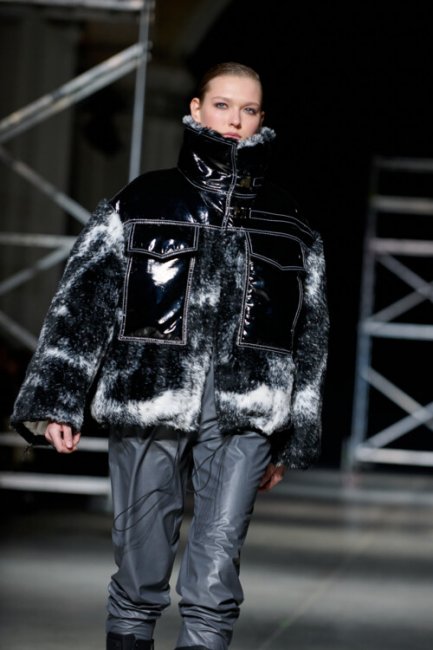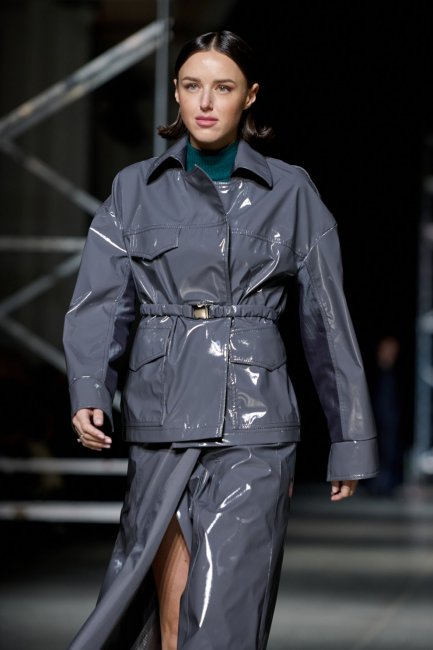 Алина Френдий на подиуме Vorozhbyt & Zemskova осень-зима 2022/2023Дизайнеры вновь делают акцент на стеганных элементах, которые применяют в комбинациях с различными материалами: бархатом, шерстью, твидом. Vorozhbyt & Zemskova решили, что не стоит ограничиваться только плащевкой. Многослойность предоставила возможность сыграть на контрастах, поэтому часто возникают комбинации мягкости со строгостью, как, например, в сочетании эко меха с холодным эко лаком. Жесткость и решительность характера big city girl было решено подчеркнуть пиджаками и блузами из мужской костюмной ткани, предавая образу некой маскулинности. Большой город нашел свое отображение и в силуэтах коллекции – они довольно массивные: широкие плечи, большие объемы, крупные детали. Стоит обратить внимание, как дизайнеры обыгрывают излюбленную металлическую фурнитуру – в этот раз используются застежки фастекс, которые менее деликатны в сравнении с ординарными вариантами.