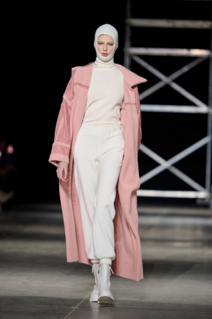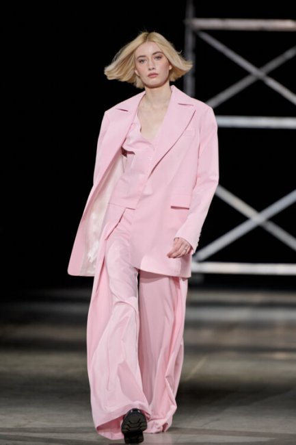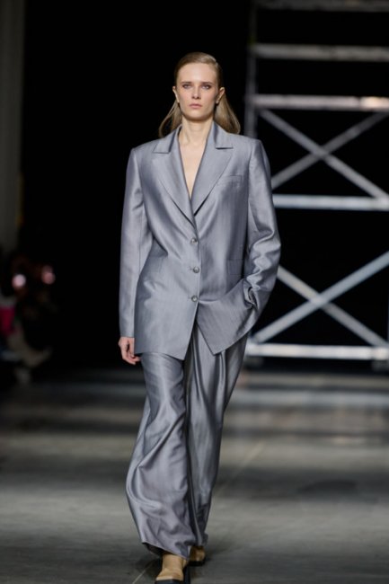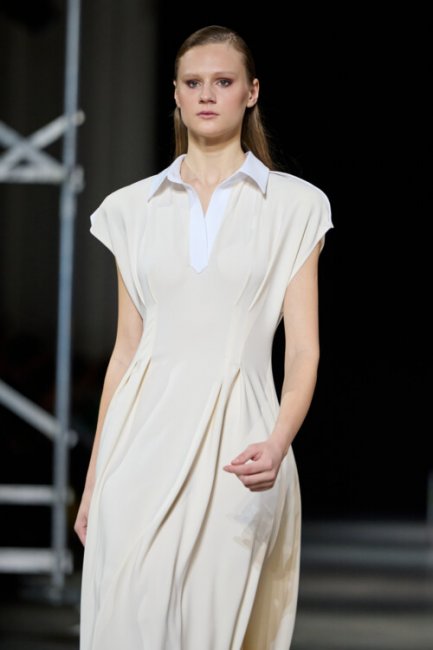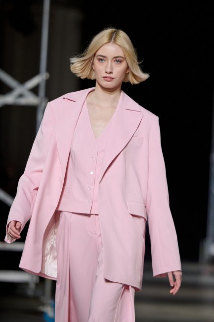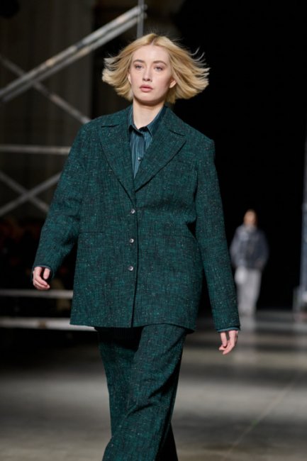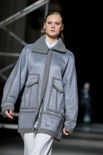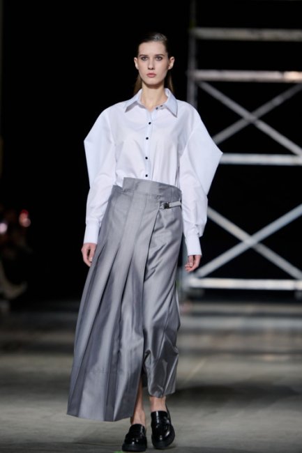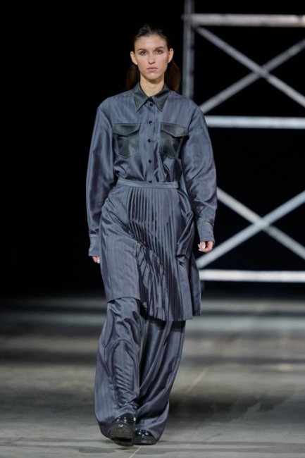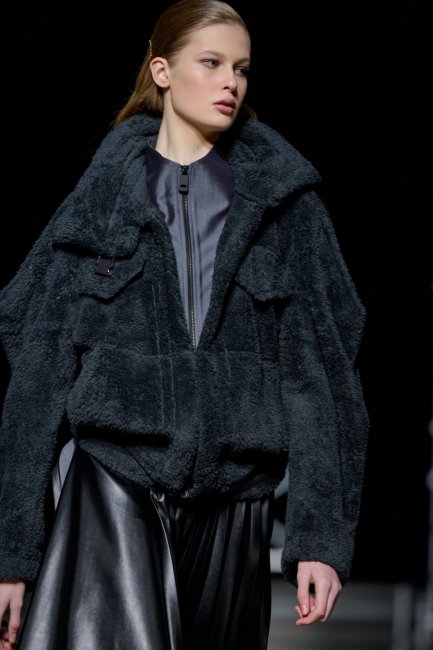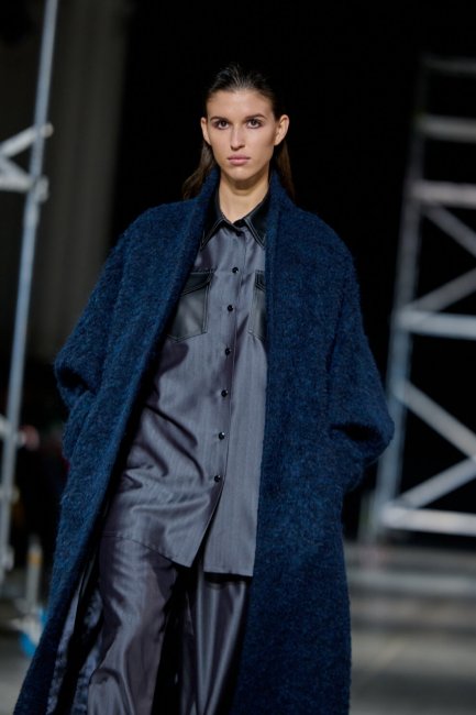 Алина Френдий на подиуме Vorozhbyt & Zemskova осень-зима 2022/2023Дизайнеры вновь делают акцент на стеганных элементах, которые применяют в комбинациях с различными материалами: бархатом, шерстью, твидом. Vorozhbyt & Zemskova решили, что не стоит ограничиваться только плащевкой. Многослойность предоставила возможность сыграть на контрастах, поэтому часто возникают комбинации мягкости со строгостью, как, например, в сочетании эко меха с холодным эко лаком. Жесткость и решительность характера big city girl было решено подчеркнуть пиджаками и блузами из мужской костюмной ткани, предавая образу некой маскулинности. Большой город нашел свое отображение и в силуэтах коллекции – они довольно массивные: широкие плечи, большие объемы, крупные детали. Стоит обратить внимание, как дизайнеры обыгрывают излюбленную металлическую фурнитуру – в этот раз используются застежки фастекс, которые менее деликатны в сравнении с ординарными вариантами.