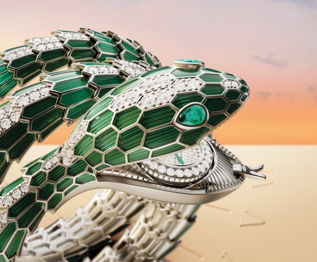 Его уникальные пропорции обусловлены необычным расположением, скрытым в голове змеи, тело которой имеет два оборота вокруг запястья и элегантно скользит по руке владельца. Увидеть секретный часы можно, нажав на язык роскошной рептилии. Кстати, сам корпус часов не прикреплен к браслету навсегда, легким движением пальцев часы можно извлечь из головы змеи, чтобы, например, отдать на чистку.