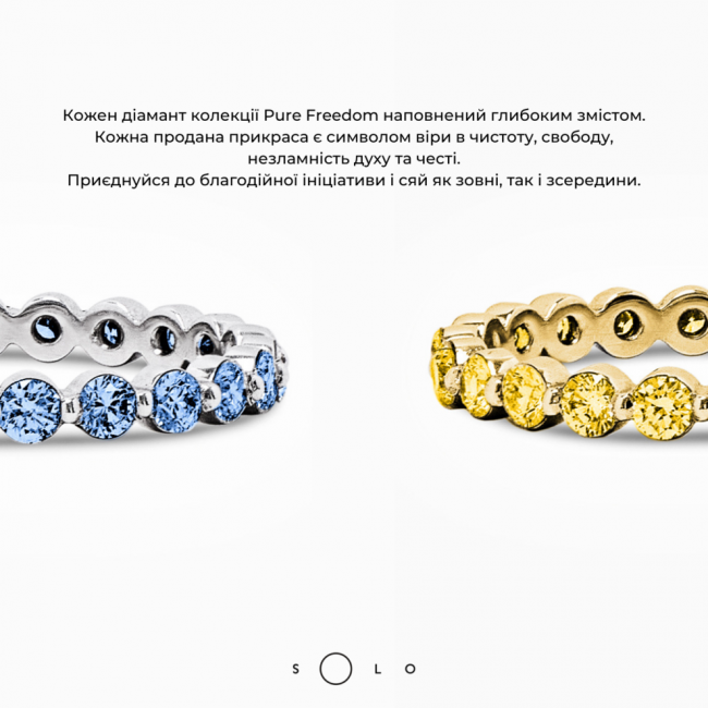 Як і кожен українець, компанія SOLO for diamonds щосили намагається допомогти країні, підтримуючи її економіку. Тож бренд в екстремальних умовах запустив виробництво та створив нову колекцію каблучок Pure Freedom у кольорах української державної символіки.