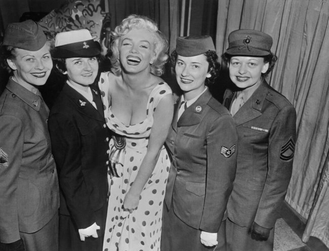 10 / 19Мерилін Монро стоїть із жінками з армії США, ВМС, ВПС та Корпусу морської піхоти