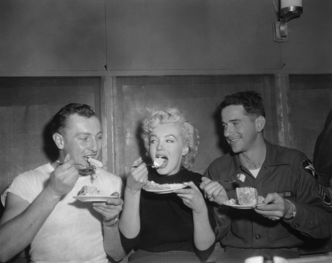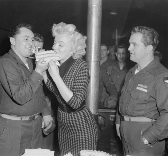 14 / 19Мерилін Монро їсть торт у їдальні роти 2-ї піхотної дивізії поблизу Сеула, Південна Корея, 18 лютого 1954 року
