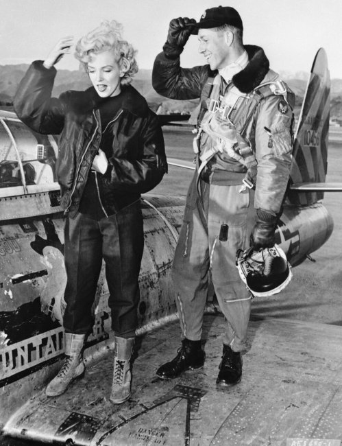 Мерилін Монро та 2-й лейтенант Гарднер Х. Сноу на крилі F-84 Thunderjet BBC США обговорюють бойові дії в Кореї, 27 лютого 1954 року