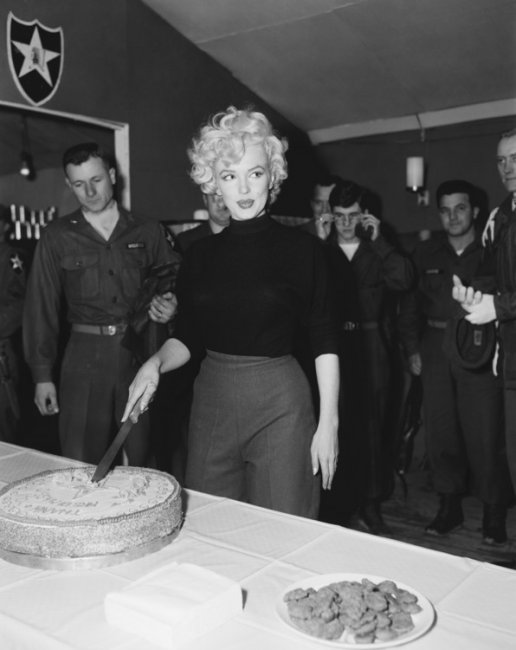 3 / 19Мерилін Монро розрізає торт, який їй подарували сержанти 2-го дивізіону, 19 лютого 1954 року