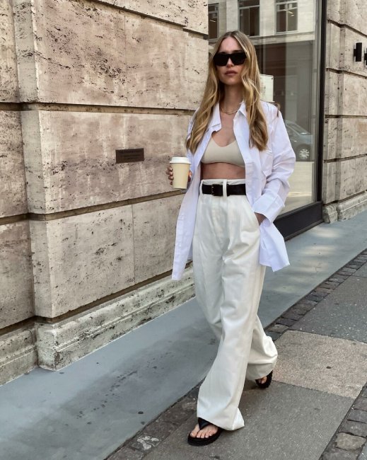 З маскулінною сорочкоюТренд на маскулінність не втрачає своєї актуальності цього літа. Дизайнери пропонують вибирати об’ємні жакети, ніби зняті з чоловічого плеча, і бавовняні сорочки навмисне вільного крою. Останні – універсальний елемент літніх образів, адже їх можна римувати з купальниками на морському курорті, міксувати із широкими штанами в ділових образах або вдягати з білими джинсами в повсякденних виходах. Модний приклад стилізації показала фешн-інфлюенсерка Перніль Тейсбек.
