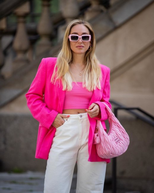 З яскравим жакетомКрім монохромних білих образів, цього літа пропонуємо комбінувати світлий денім з яскравими жакетами. Жовті, блакитні, зелені, рожеві або оранжеві блейзери складуть модну партію на щодень універсальним білим джинсам і додадуть барв сірим будням. Беріть приклад з модної інфлюенсерки Соні Лісон, яка вміло впроваджує яскраві відтінки у свій гардероб.