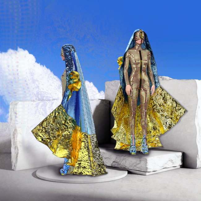 Helen DoГості показу перемістилися у віртуальний всесвіт, наповнений українськими колосками та омріяним мирним небом. Блакитне небо й золотисте поле — 3D-версія прапора України, на фоні якого дизайнерки представили одяг, натхнений українськими культурними кодами. У пшеничному полі з’явилися футуристичні конструкції, які символізують нове сприйняття дійсності та майбутнє України.