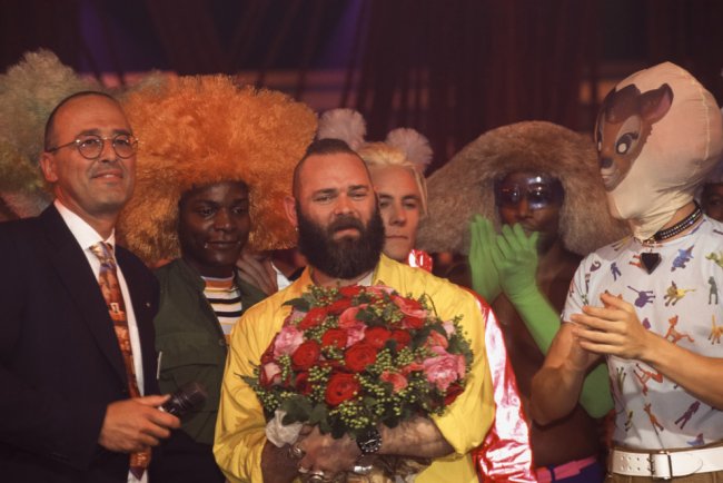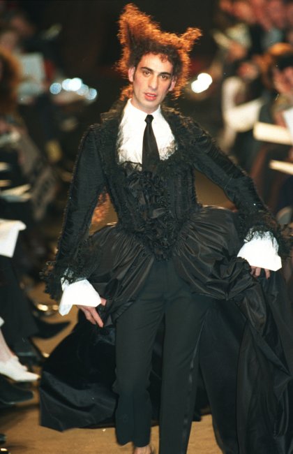 Jean Paul Gaultier Haute Couture весна-літо 1998Jean Paul Gaultier Haute Couture весна-літо 1998Серед провідних дизайнерів Жан-Поль Готьє відомий своїм прийняттям і святкуванням квір-естетики: від одягання чоловіків у спідниці в 1985 році до неодноразового використання бретонки. Впродовж багатьох років Готьє також співпрацював зі своїм другом і музою Танелем Бедроссіанцом. На своєму шоу весна-літо 1998 року під впливом епохи Просвітництва Бедроссіанц з’явився в сукні з корсетом і рюшами, одягнутій поверх білої сорочки й краватки — образ увійшов в історію й доданий до каталогу Camp: Notes on Fashion.