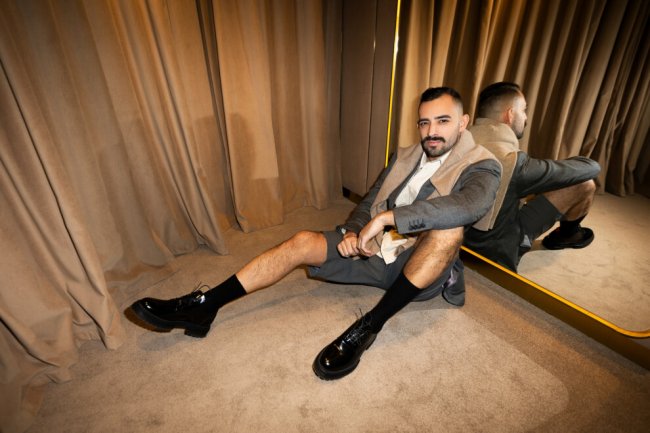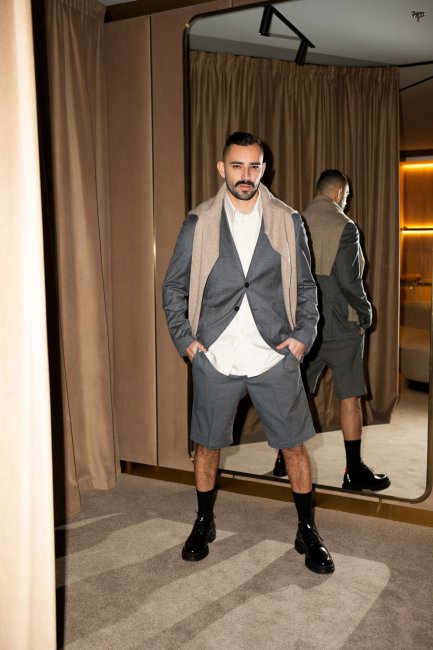 Партнер Havas Digital Kyiv Ден Логвин на сейлах ЦУМ Киев примерил самую актуальную модель мужского костюма последних нескольких и, наверняка, будущих сезонов — двойку с шортами. Наряд Дена собран из шерстяного пиджака LAB Pal Zileri, серых шорт PT Pantaloni, молочной рубашки Lemaire и грубых туфель бренда 424. Как и на примере Дениса, подобные костюмы хорошо смотрятся с высоко подтянутыми носками, а накинутый на плечи свитер, в случае шерстяной Iro, сделает образ более выразительным и интересным.