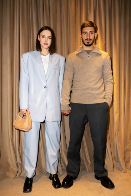Алина Френдий и Петр Заставный – одна из самых популярных пар украинского Instagram — примерили классические образы, которые отлично подойдут как для похода в офис, так и для встречи с друзьями. Так, Алина выбрала брюки и жакет Nanushka из эко-кожи нежно-голубого оттенка, белый топ в рубчик Free People Movement, лаковые лоферы испанского бренда Miista и дополнила образ бежевой сумкой Danse Lente.