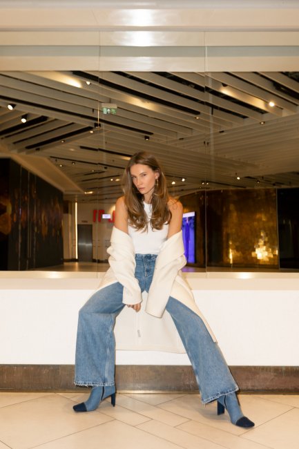 Модель Таня Богдан примерила самый уютный и комфортный образ из осенней коллекции ЦУМ: джинсы клеш Ba&Sh, белый универсальный топ Free People, ботинки на устойчивом каблуке Miista из контрастного денима, и легкое пальто Eleventy молочного цвета. Такой образ идеально подойдет для камерных семейных вечеров, а если добавить к наряду объемный теплый шарф и шапку крупной вязки — в нем можно отправиться на прогулку по городу.