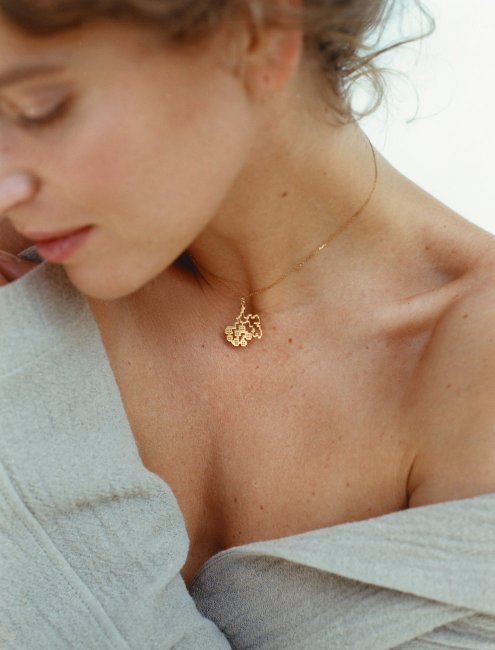 Guzema Fine JewelryНайголовніший образ колекції – калина, що символізує рідну землю та батьківський дім. "Це ще один мотив моєї особистої історії – зараз я перебуваю далеко від дому, тимчасово живу за кордоном та мрію повернутися в Україну назавжди. Я використала калину в прикрасах мимоволі й не відразу зрозуміла, яким потужним є цей плід підсвідомості". Форма кулона з колекції – піксельна. Це, з одного боку, нагадує схему для вишивання, а з іншого – це ще один тонкий мотив, що відсилає нас до піксельного візерунка форми українських бійців та нагадує про те, що в Україні триває війна й точиться боротьба за незалежність.
