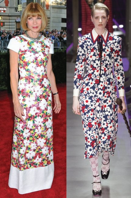 Вот главное модное правило от Винтур — найти фасон, который «работает», и строго его придерживаться. Она редко предстает перед публикой в чем-то однотонном или темном, отдавая предпочтение ярким оттенкам и флористическим принтам. Именно цвет помогает ей «сбросить» энное количество лет. Говорят, что у Винтур самая большая коллекция платьев в цветочек, которые она дополняет массивными ожерельями.