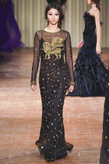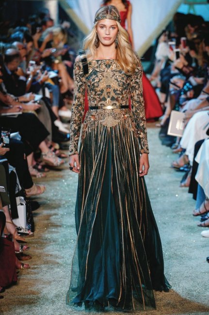По словам самого Эли Сааба, работая над осенней коллекцией haute couture, он держал в голове сцену из «Игры престолов», где Санса Старк готовится к своей свадьбе. Ее тяжелое расшитое платье и послужило прототипом для роскошных нарядов, представленных ливанским дизайнером на парижском подиуме. Бархат и шелк, золотое шитье и и кожаные детали помогают создать атмосферу вымышленного царства, населенного воинственными королями и героическими женщинами.