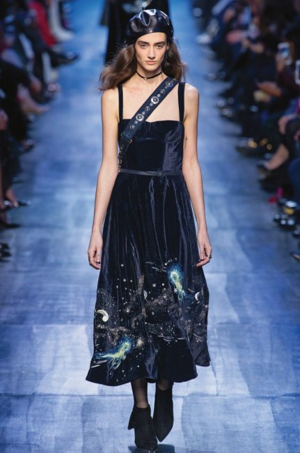 Новый креативный директор легендарного Дома Мария Грация Кьюри избегает излишне смелых экспериментов, явно ориентируясь на классическую женственность. Вот и ее осенняя коллекция элегантно проста, даже минималистична, и выполнена целиком в темно-синей гамме (кстати, любимом цвете Кристиана Диора). На платьях и юбках явно читаются мотивы Марка Шагала, который тоже обожал глубокий синий цвет, создававший романтичную и вместе с тем загадочную атмосферу многих его полотен.