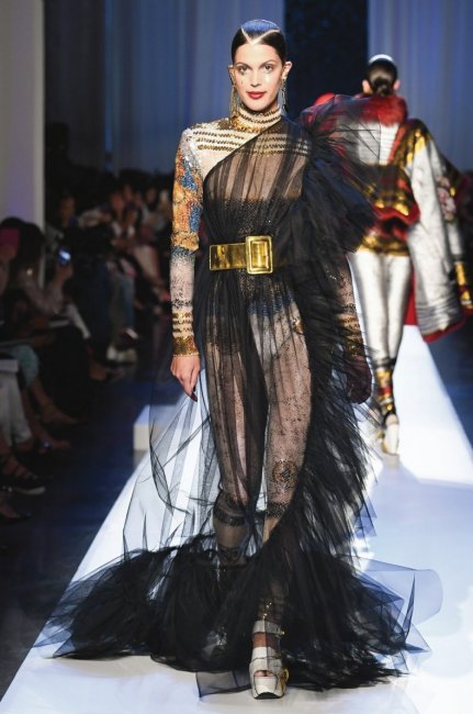 Мастер бурлеска и эпатажа, Готье мастерски умеет сочетать разные фактуры, цвета и стили разных эпох. В новой кутюрной коллекции дизайнер решил объединить разные культуры Востока. В ней целых восемнадцать хиджабов и фрагменты еврейского костюма, но наиболее эффектно смотрелись его интерпретации традиционного индийского сари, дополненные, естественно, индийскими украшениями для носа.
