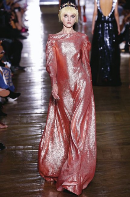 Главным действующим лицом кутюрной коллекции Альберты Ферретти, выполненной в стиле двадцатых, стал мир подводных глубин. Шелковые платья с иллюзией тату украшали драгоценные раковины и морские жемчужины. Особую роль дизайнер отвела бахроме — она украшала лифы и подолы, а несколько платьев полностью состоят из тончайших переливчатых нитей.