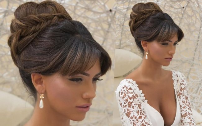 Волосы можно собирать в элегантную корзиночку, делать всевозможные жгуты и укладки в стиле бохо. На фото видно, что такая прическа отлично сочетается с челкой, но можно делать укладку и без нее.