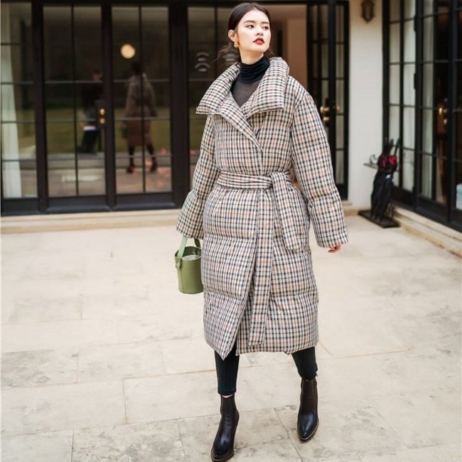 Такая модель пухового пальто выглядит очень женственно. Пояс или кушак позволяет сделать акцент на талии. Также подобный пуховик хорошо сочетается с платьями, юбками и брюками. Дополнить свой образ можно сапогами на каблуке.