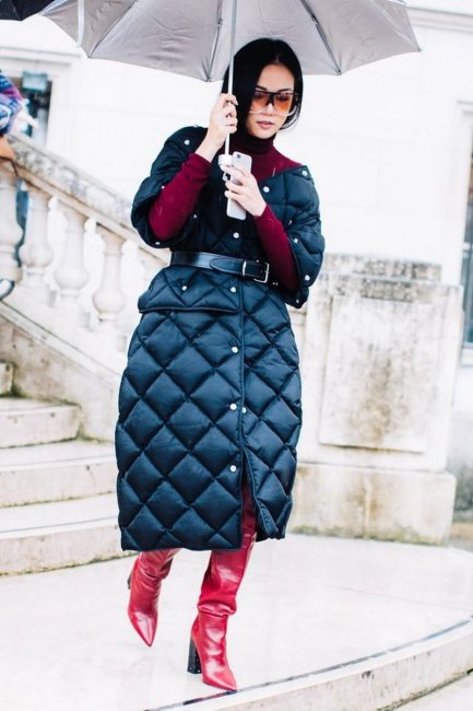 Такой предмет гардероба выглядит достаточно гламурно, поэтому и сочетать его надо с женственными вещами. В образ с пуховиком обязательно следует добавить юбку-карандаш, а также сапоги на высоком каблуке. Однако шпильки лучше не использовать.