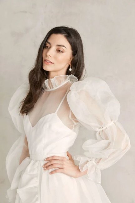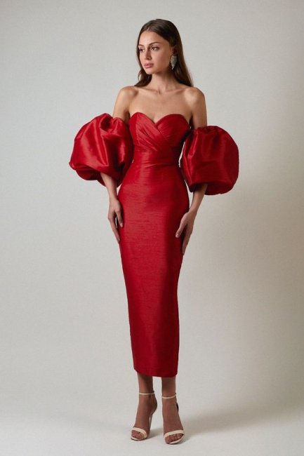 Изысканный лук обеспечивается благодаря короткому платью с открытыми плечами и пышными рукавами. Сделать образ завершенным получится с помощью маленького клатча, больших сережек и распущенных волос.