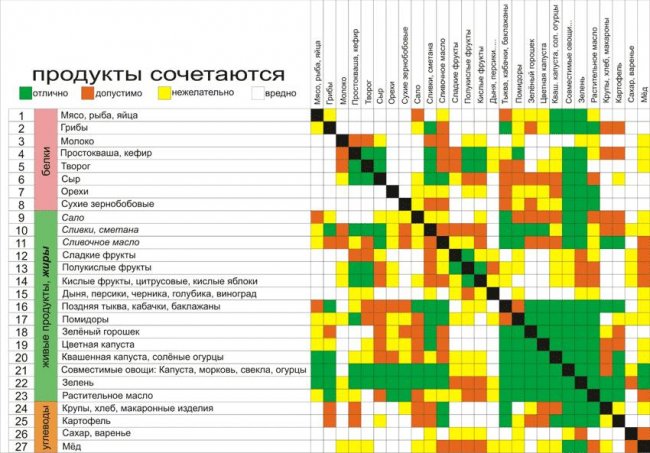 Думаю, что определить, к какому типу относится продукт согласно своим вкусовым особенностям вам не составит особого труда, поэтому переходим к следующему разделу статьи, а именно, как правильно сочетать между собой различную привычную нам пищу. Нежелательные сочетания продуктов между собой.