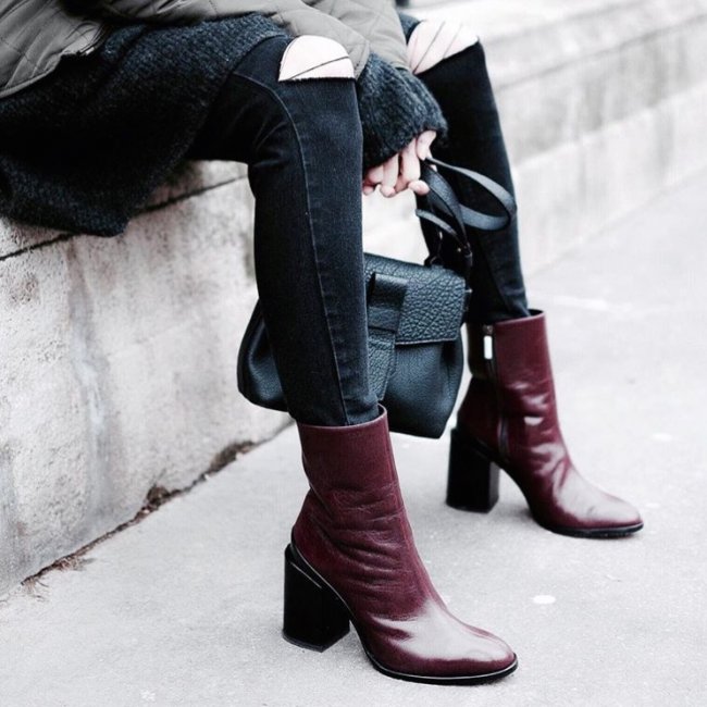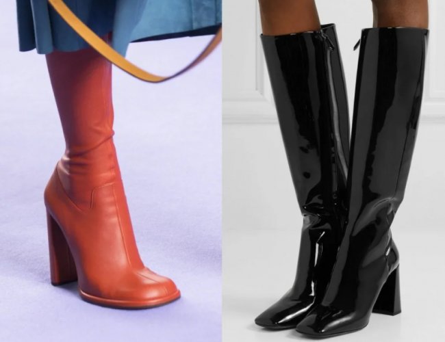 Квадратный мыс — еще один важный акцент современного стиля. Мода 90-х остается ключевым вариантом при выборе сапог или ботильонов в 2022 году. Квадратная форма в сочетании с необычными каблуками станет изюминкой образа. К такой обуви не потребуется яркий наряд, можно использовать минимум деталей.