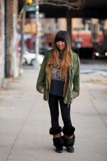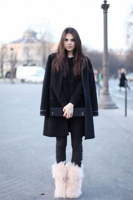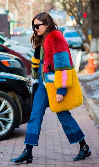 В этом же стиле подбирают по цвету пальто, кардиган или теплую накидку. Пальто выбирают длинное, из искусственного или натурального меха. Ткань должна быть теплая, цвет меха насыщенный. Искусственные или натуральные шубки также в моде. Их носят с обувью на каблуках. Пуховики или укороченные дубленки не выходят из моды. Яркий рисунок или декоративный узор, выбитый на ткани, эффектно дополнит образ и позволит выделиться.