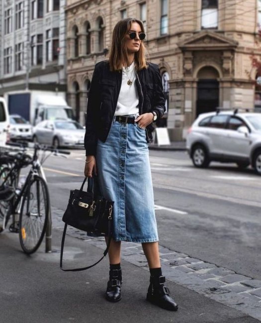 Джинсовая юбка темного цвета уникально сочетается со свитером белого цвета крупной вязки. Дополнят образ драповое коричневое пальто средней длины и замшевые ботильоны на толстом каблуке. Насыщенного зеленого цвета шарфик и сумочка станут изюминкой лука. Серьги и браслет подбирают к цвету обуви.