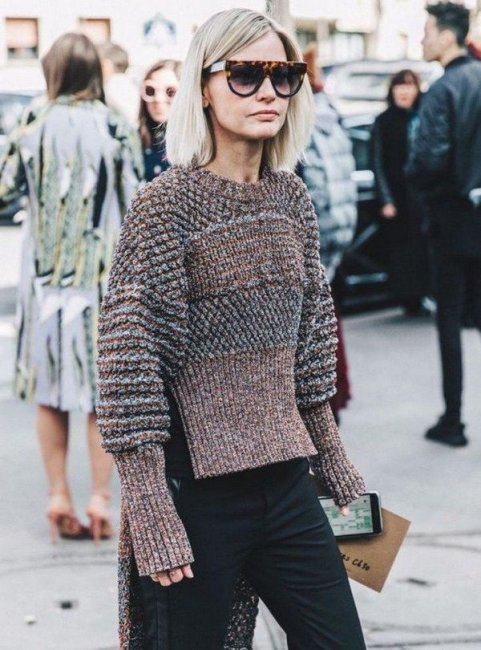 В моде шерстяные свитера с орнаментом, кардиганы крупной вязки. Эффектно смотрится одежда с ахроматическими и комбинированными цветами. Свитера могут быть с необычным верхом, короткие или асимметричные.